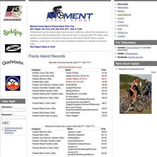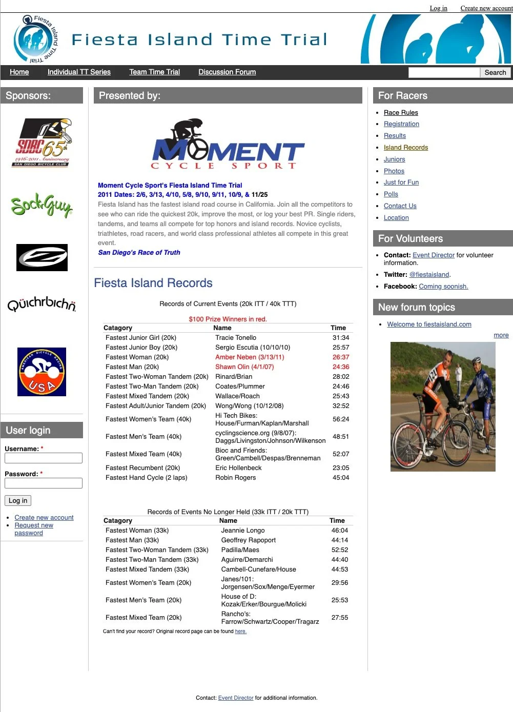 The course records listed here have been compiled from historical data of the Time Trial events, gathered from the old www.fiestaisland.com website and FITT data since the San Diego Bicycle Club (SDBC) began re-coordinating the event in March 2013. These records showcase the fastest times ever achieved on the iconic Fiesta Island course.